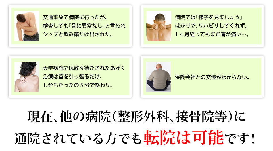 どこの医療機関に通院するか決める権利は患者であるあなたにありますので、転院可能です。その後、損保会社の担当者に連絡されるか、直接こちらに来院されて当院から損保会社に連絡することも可能です。