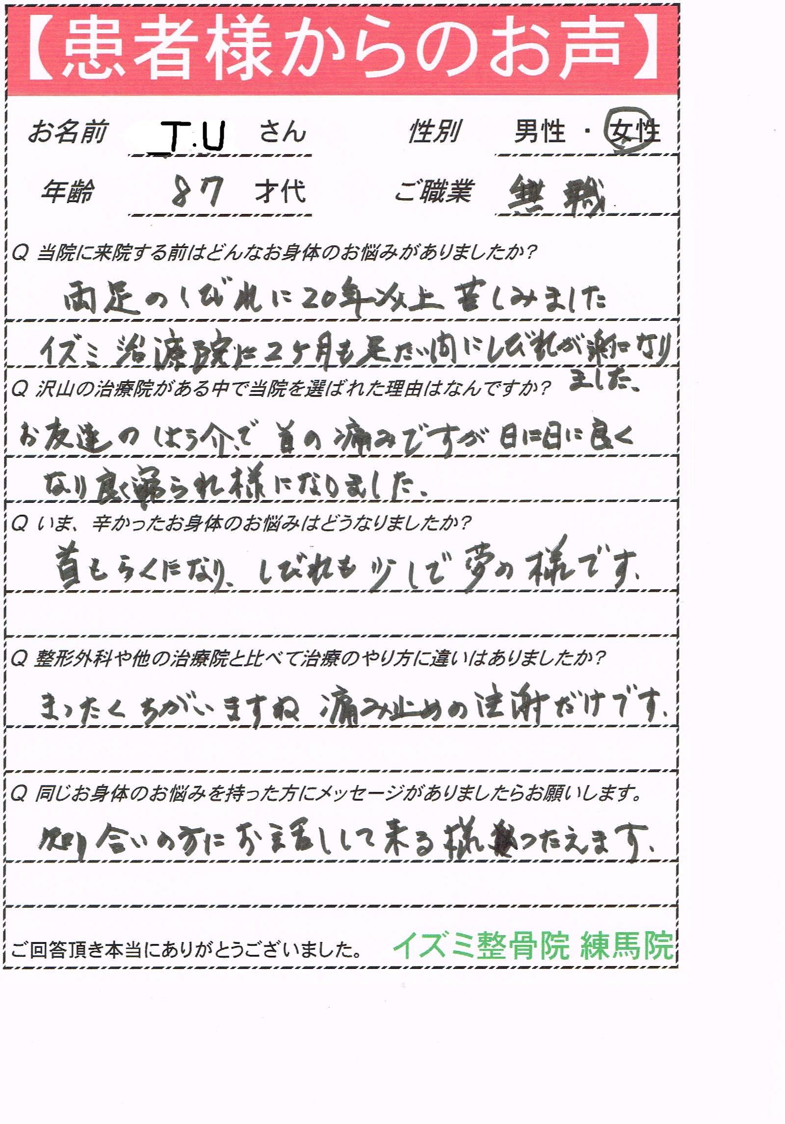 お名前 : T.Uさん 性別 : 女性 年齢 : 87才 職業 : 無職