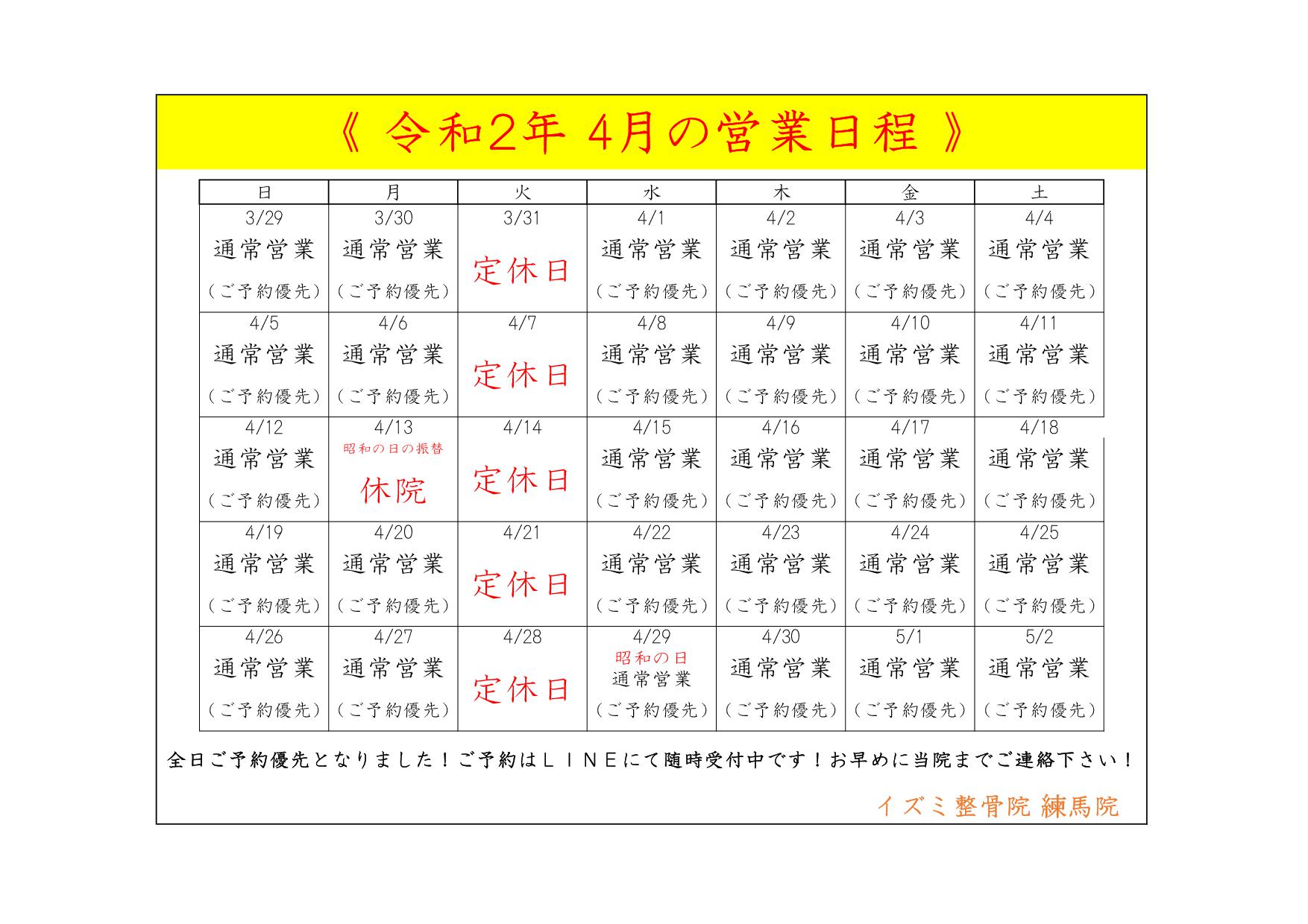 【令和2年4月の営業日程および新型コロナウィルスについて】